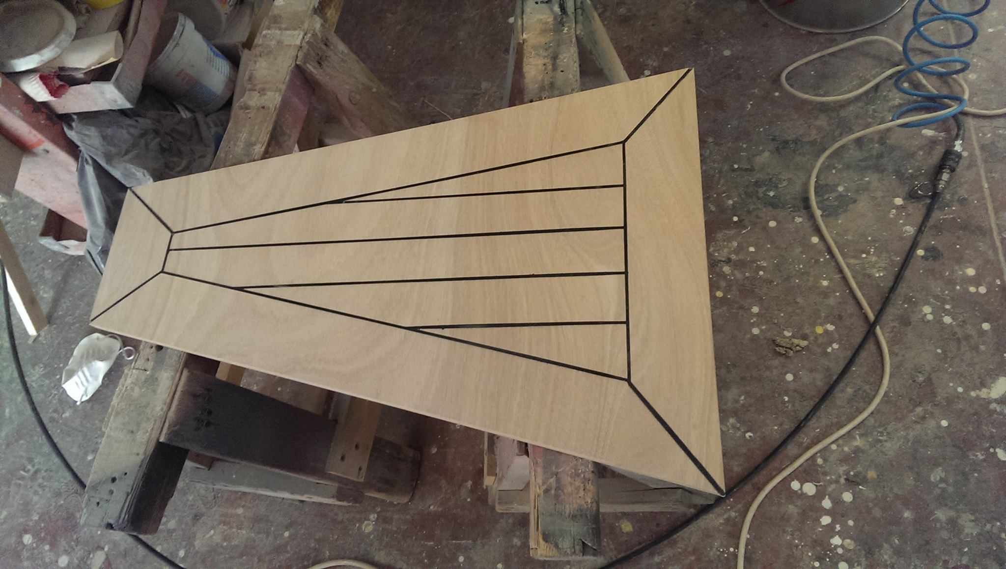 before throwing them in the garbage use them as templates for the new ones “teak effect” : basically they’re made with a layer of marine grade 10-12 mm plywood (okumè or mahogany), routed to simulate teak planking, decorated with black sika strips filling the routings, faired and covered with semigloss painting to protect them.